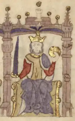 ![]() Ilustración del rey Alfonso. Compendio de crónicas de reyes del Antiguo Testamento, gentiles, cónsules y emperadores romanos, reyes godos y de los reinos de Castilla, Aragón, Navarra y Portugal (c. 1312–25). | ||