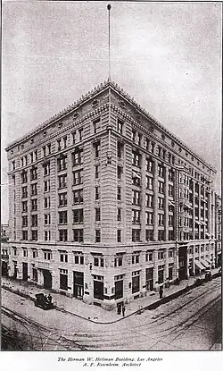 En 1902, Rosenheim recibió un encargo de Herman W. Hellman para diseñar el edificio Hellman, que sería el edificio con estructura de acero más grande de Los Ángeles. Se mudó a Los Ángeles en febrero de 1903 para supervisar personalmente su construcción, que continuó hasta noviembre de 1904.[2] La impresionante estructura de ocho pisos ubicada en el corazón del nuevo distrito financiero de la ciudad estableció la reputación de Rosenheim en la joven ciudad. The Architect and Engineer of California escribió que el edificio "universalmente se considera el mejor monumento arquitectónico de Los Ángeles", construido a un costo sin precedentes de $ 1 millón.[2] La estructura se construyó con un armazón de esqueleto de acero completo, pisos de concreto y tabiques de metal.