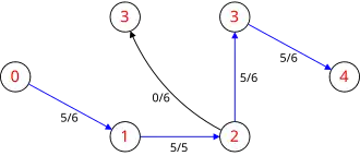 Esta es una simulación del algoritmo de Dinic. En el nivel del grafo , los vértices marcados en rojo son los valores . Las rutas en azul forman el bloqueo de flujo.