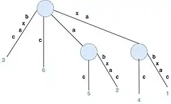 Si el camino para termina en una hoja, el carácter se añade al final de la etiqueta de la arista incidente en esa hoja.