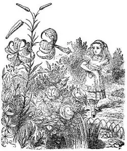 Cuando Alicia sale de la casa, entra en un jardín en el que las flores hablan. La principal de todas las flores del jardín, el Lirio, trata a la niña como si se tratara de otra flor.