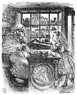 ![]() Página de A través del espejo y lo que Alicia encontró allí, con ilustración de John Tenniel. | |||||