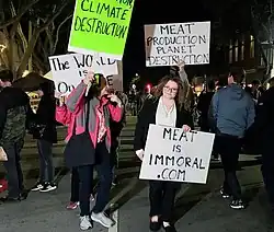 El alcance de los impactos ambientales depende de los métodos de producción de alimentos y los tipos de alimentos producidos.[11] La Unión de Científicos Preocupados aconseja que evitar comer carne de vacuno puede potencialmente ayudar al medio ambiente,[12] debido a las grandes cantidades de agua necesarias para producir carne de res, la contaminación de las heces, el amoníaco, el dióxido de carbono y los desechos de metano asociados con la cría de vacas, los daños causados por el pastoreo y la destrucción del hábitat de la vida silvestre y las selvas tropicales para producir tierras de pastoreo.[12] La carne producida industrialmente, como la de animales criados en operaciones de alimentación de animales confinados o CAFO, tiene "el mayor impacto de cualquier producto alimenticio en el medio ambiente".[13]