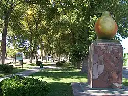 El escudo de la ciudad fue realizado por Margarita Keil en el marco de un concurso convocado por la municipalidad para este fin en 1974. Muestra dos elementos vinculados con la economía de la ciudad de mediados del siglo XX: una vagoneta con yeso y un manzano con frutos.