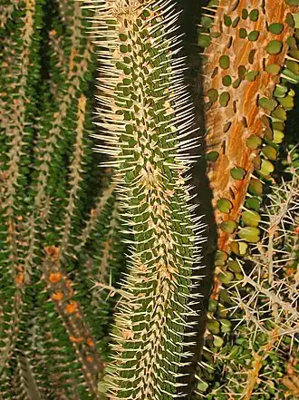 Las espinas tienen forma de aguja, miden de 2 a 2,5 cm de largo y solo se encuentran en las ramas. Además, en los brotes nuevos, debajo de cada una de estas espinas, dispuestas en espiral, aparece una sola hoja con forma obovada o semicircular y miden de 0,5 a 3,5 cm de largo. Posteriormente, cada año van creciendo dos hojas opuestas en brotes cortos, con el lado estrecho de la hoja hacia arriba. Señalar que las espinas están dispuestas alrededor de las hojas como defensa contra los herbívoros. Sin embargo, en el caso de la especie Alluaudia dumosa, las espinas y hojas son perecederas