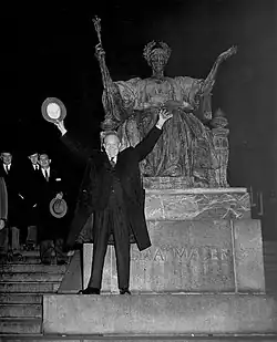 El presidente electo de los Estados Unidos, Dwight D. Eisenhower, posa frente al Alma Mater en enero de 1953