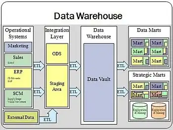 Las definiciones anteriores se centran en los datos en sí mismos. Sin embargo, los medios para obtener esos datos, para extraerlos, transformarlos y cargarlos, las técnicas para analizarlos y generar información, así como las diferentes formas para realizar la gestión de datos son componentes esenciales de un almacén de datos. Muchas referencias a un almacén de datos utilizan esta definición más amplia. Por lo tanto, en esta definición se incluyen herramientas para extraer, transformar y cargar datos, herramientas para el análisis (inteligencia empresarial) y herramientas para gestionar y recuperar los metadatos.