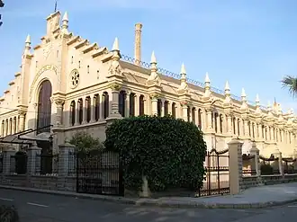 La obra está resuelta en su práctica totalidad con el ladrillo, aunque se utiliza la piedra para definir el zócalo y el cemento trabajado en molde para resolver los detalles de ornamentación, como molduras, columnas, pináculos y gárgolas. La cubierta está resuelta con cerchas totalmente metálicas y teja plana polícroma como material de cubrición.