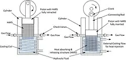 Cerca isotérmico (compresión y expansión) es un proceso en el que el aire comprimido está muy cerca de una gran masa térmica incompresible como una estructura absorbiendo y liberando calor (HARS) o agua pulverizada. Un HARS generalmente se compone de una serie de aletas paralelas. Cuando el aire está comprimido el calor de la compresión es rápidamente transferida a la masa térmica, por lo que la temperatura del gas se estabilice. Un circuito de enfriamiento externo es entonces utilizado para mantener la temperatura de la masa térmica. La eficacia isotérmica (Z) es una medida de cuando el proceso se encuentra entre un proceso isotérmico y adiabático.[6] Si la eficacia es 0%, entonces es totalmente adiabático; con una eficacia de 100%, es totalmente isotermo. Normalmente con un proceso isotermo cercano una eficacia de 90-95% puede ser esperado.