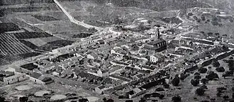 Vista de Almenara en la década de 1920, donde se distingue claramente el trazado ortogonal original, parte de los lienzos de muralla norte y este, así como el arrabal al sur y los incipientes arrabales a este y oeste.