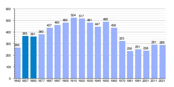 | Gráfica de evolución demográfica de Almenara de Tormes[17] entre 1842 y 2021 |