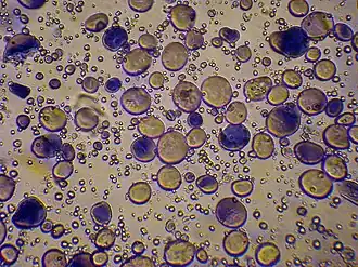 La mayor parte de los granos de almidón de las células del endospermo prismático y central del trigo tiene dos tamaños: grande, 30-40 micras de diámetro, y pequeño, 1-5 micras, mientras que los de las células del endospermo sub-aleurona, son principalmente de tamaño intermedio 6-15 micras de diámetro. En las células del endospermo sub-aleurona hay relativamente más proteína y los granos de almidón están menos apretados que en el resto del endospermo.