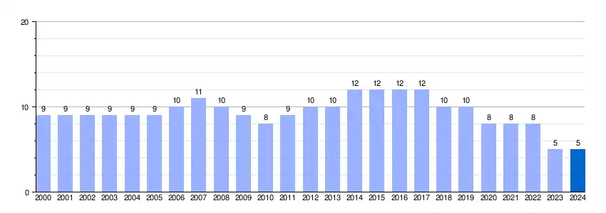 | Gráfica de evolución demográfica de Almuzara[7] entre 2000 y 2024 |