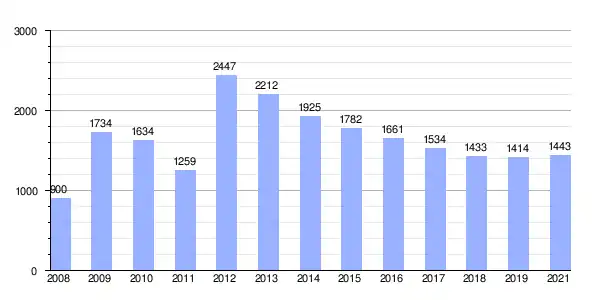 | Gráfica de evolución demográfica de Alosno[7] entre 1842 y 2021 |