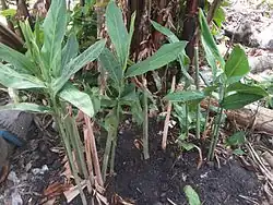 Es una planta herbácea perennifolia crece desde un rizoma (llamado Laos o Jengibre azul) y alcanza los 1,2 metros de altura con abundantes y grandes hoja] y frutos rojos. Las hojas miden 30 cm de largo con nervios longitudinales y paralelos, son cartagilanosas, alternas, lanceoladas, enteras y agudamente acuminadas. Las flores aparecen en una inflorescencia en forma de panículo terminal de unos 20-30 cm de largo. El fruto es una cápsula globular y ovoide con tres valvas.[2]