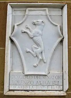 El escudo de armas de los Altoviti es un lobo plateado desollado sobre un fondo negro y hace referencia a un lobo legendario que se dice que salvó al fundador de la familia al destrozar a uno de sus enemigos.