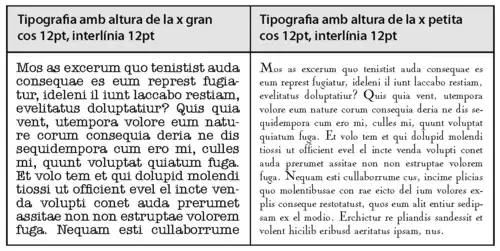 Las tipografías con una altura de la x grande con respecto al cuerpo tienen ascendientes y descendientes cortos. Con una regleta igual al tamaño del cuerpo, el texto tiene un aspecto pesado, da un gris demasiado oscuro, le falta blanco. En cambio las tipografías con una altura de la x pequeña, con ascendientes y descendientes largos dan un gris mucho más claro. Para compensar este efecto, las tipografías con una altura de la x gran deben aumentar la interlínea, lo que anula en parte la economía de espacio conseguida al aumentar la altura de la x.