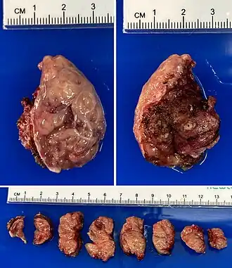 | Amígdalas linguales | Escamoso estratificado no queratinizado | Encapsulado incompletamente | Largo, no ramificado[3][4] | Detrás del surco terminal (lengua) |