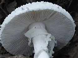 Las láminas están muy juntas y separadas del tallo. Al principio son de color crema, pero pueden tornarse blancas a medida que el hongo madura. Son frecuentes las lamelas cortas. El tallo es blanco y mide 10-20 cm largo y 1-2 cm de espesor. Se estrecha ligeramente hacia la parte superior y tiene una textura que va de suave a peluda. Hay un anillo, grueso y a menudo de doble borde, cuya parte inferior parece un tejido. El velo universal cuelga de la parte superior del estípite.[6] El bulbo basal es bastante grande en tamaño, con círculos concéntricos de escamas que creen hacia abajo. Los restos volvales se adhieren y causan manchas irregulares.[6]