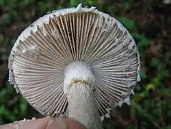 Las escámulas están menos pobladas cerca del borde del sombrero (el margen). El borde no tiene estrías y suele estar bordeado por restos del velo. Las láminas de la parte inferior del sombrero están muy juntas y libres o estrechamente unidas al pie. Son de color blanco a crema, y están intercaladas con lamélulas cortas (branquias que no se extienden completamente desde el borde del sombrero hasta el pie).[3] Las branquias pueden parecer encharcadas.[4]