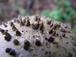 El pie mide de 5,5 a 12 cm (2 a 4 1⁄2 pulgadas) de largo, de 0,6 a 1,5 cm (1⁄4 a 1⁄2 pulgadas) de grosor y se estrecha ligeramente hacia arriba. Es de color gris sólido a gris parduzco cerca de la base, más pálido hacia la parte superior, y parece algodonoso (flocoso) o velloso (fibriloso). El bulbo de la base del estípite tiene forma de huso o nabo y puede enraizar profundamente en el suelo, sobre todo si éste está suelto.[5] El velo parcial es de vida corta, blanco y se adhiere justo por debajo de la parte superior del estípite. Es pegajoso y en la madurez a menudo se adhiere a la parte superior del estípite, o puede tener algunos restos escasos colgando del borde del sombrero. Los restos de velo universal se disponen en hileras de verrugas y manchas de pequeñas escamas de color gris a gris parduzco sobre la parte superior del bulbo; por debajo, el color es un blanco sucio. La carne es firme y blanca.[3] El olor de los cuerpos fructíferos puede variar de suave a "ligeramente desagradable".[6] El olor se ha descrito como parecido al "cloruro de cal",[7] un olor similar al de algunos desinfectantes de baño que contienen lejía.[8]