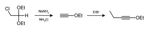 - ↑ Newman, M. S.; Stalick, W. M. (1977). "1-Ethoxy-1-butyne". Org. Synth. 57: 65; Coll. Vol. 6: 564.