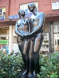 La escultura, hecha en bronce, es obra de Santiago de Santiago, y está datada en 1993.[1][2] Representa a un hombre y una mujer desnudos tomados de las manos en una actitud cariñosa, de gran afectividad. Las figuras presentan suaves curvas y en el bronce oscuro pulido y brillante en que están realizadas. Formando parte de la escultura hay una fina plataforma cuadrada, del mismo material, que presenta una leyenda: