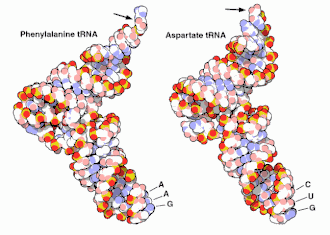 Dos moléculas de aminoacil-ARNt, a la izquierda la fenilalanil-ARNt, el aminoácido señalado con una flecha y el anticodón GAA, a la derecha un aspartil-ARNt mostrando el aminoácido (flecha) y el anticodón GUC