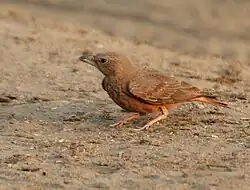 La terrera colirroja (Ammomanes phoenicura)[2] es una especie de ave paseriforme de la familia Alaudidae que habita en zonas pedregosas abiertas y secas de la India y el noreste de Pakistán. De manera similar a otras especies de este género posee un pico prominente tipo pinzón con un borde ligeramente curvado hacia la mandíbula superior. El color marrón opaco es similar al del suelo ya que se alimenta de semillas, granos e insectos. Los machos y hembras son indistinguibles en el campo pero durante la temporada de cortejo, el macho desarrolla un baile en el cual levanta vuelo en forma abrupta y luego cae en picada acompañado por una llamada distintiva. Se alimentan a nivel del suelo en parejas o grupos reducidos.