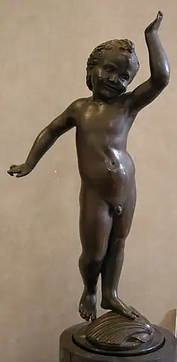 La historia de esta escultura ha sido cambiada por Francesco Caglioti (2004). Según él, el trabajo era parte de una prueba, descartada, de una serie de cuatro querubines para la pila bautismal de Siena, como demuestra su afinidad con uno de los ejemplares para dicho trabajo. Aparte de algunas diferencias en la forma básica, la escultura se puede poner en relación directa con los otros seis putti de la fuente bautismal, tres de giovanni di Turino, el danzante, el jugador con la pelota y otro perdido, y tres de Donatello, dos de los cuales siguen en el lugar, el danzante y el tocador de trompeta. El tercer amorcillo de Donatello es probablemente un tocador de la pandereta, hoy en Berlín. Seguramente, el Amorcillo danzante, se mantuvo mucho tiempo en el taller del maestro, hasta, que quizás a través de Bertoldo di Giovanni, llegó a las colecciones de los Médici, donde se registró documentalmente, pasando después a los grandes duques y finalmente al Estado.