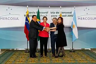 | Reunión de Mercosur en Caracas, 2005. | Reunión en Córdoba, 2006. | Hugo Chávez, Dilma Rousseff, José Mujica y Cristina Fernández en Brasilia, 2012 |