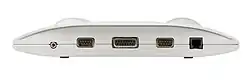 Salida de audio, 2x conectores de controlador digital, puerto de controlador analógico (estándar de IBM), conector Lightgun (RJ11), salida de audio y video RGB (8 pines DIN), toma de alimentación de la fuente de alimentación externa, toma de alimentación del monitor.