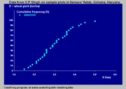El análisis de la frecuencia acumulada se aplica a una colección de datos observados de un fenómeno (X).[2] La colección puede ser en dependencia del tiempo (por ejemplo la lluvia medida en un sitio) o del espacio (por ejemplo cosechas de cultivos en el área), o puede tener otra dependencia.