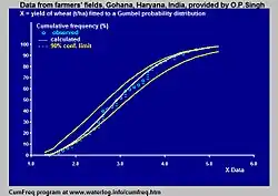 - ↑ Ejemplos de aplicación de CumFreq se encuentran en: Drainage Research in Farmers' Fields: Analysis of Data. Part of project “Liquid Gold” of the International Institute for Land Reclamation and Improvement (ILRI), Wageningen, The Netherlands. On line : [4]
