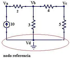 - Seleccione un nodo de referencia (polo a tierra). Se puede elegir cualquier nodo ya que esto no afecta para nada los cálculos; pero elegir el nodo con más conexiones podría simplificar el análisis.