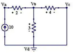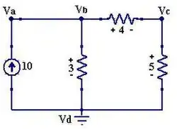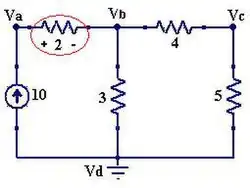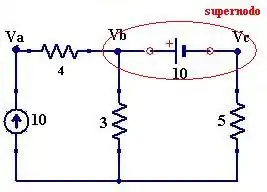 En este circuito, inicialmente tenemos dos tensiones desconocidas, V1 y V2. La tensión en la terminal positiva de VB ya se conoce porque la otra terminal se encuentra en el nodo de referencia. La corriente que pasa por la fuente de voltaje VA no puede ser calculada directamente. Además no podemos escribir las ecuaciones de corriente para V1 y V2. Incluso si los nodos no pueden resolverse individualmente, sabemos que la combinación de estos nodos es cero. Esta combinación de los dos nodos es llamada el método de supernodo, y requiere una ecuación adicional, que involucre las tensiones que afectan a la fuente, V1 = V2 + VA.