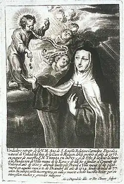 - ↑ «Vida de la Madre Ana de San Agustín / dictada por ésta misma y firmada en 1606», Biblioteca Nacional de España, Mss/6472. «Traslados de la carta de Fray Alonso de Jesús María General de la Orden del Carmen, a la Madre Ana de San Agustín, ordenando que escriba su biografía, el 7 de febrero de 1609. Fechados el 28 de septiembre de 1629 (h. II). Vida de la Madre Ana de San Agustín, dicha por ella y escrita por la Madre Antonia de Jesús. Valera 12 de agosto de 1609. Firmas autógrafas», BNE, Mss/13523. Otras copias en Mss/7223 y Mss/2191: «Brebe relación de la vida y virtudes de la Venerable Me Anna de S. Agustín Carmelita descalza y compañera de la Virgen S. Theresa de Iesus en la Fundación del Convento de Villa nueva de la Jara y después Fundadora del Convento de Valera de Abajo que se trasladó a la Villa de S. Clemente (todo Diócesis de Cuenca) donde fue muchos años Priora y donde murió Año de 1624 y está su venerable cuerpo incorrupto, y por su interrcessión obra Nro. Señor muchas maravillas tenidas por milagrosas como se verán en esta brebe Relación». Además en Documentos referentes a los carmelitas descalzos, Mss/13751 y en el Mss/13292 de Papeles varios, la Revelación de Ana de San Agustín, sobre el infierno y la gloria. No hay biografía impresa hasta la de Alonso de San Jerónimo, Vida, virtudes y milagros de... Ana de San Agustín, carmelita descalza, Madrid, por Francisco Nieto, 1668, con el retrato de la monja según Abraham van Diepeenbeck grabado por Peeter Clouwet.