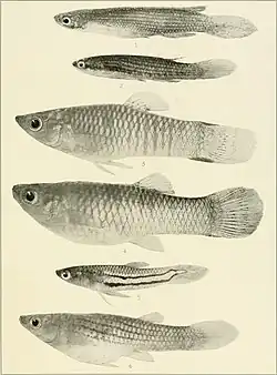 - ↑ Huber, J.H., 1992. «Review of Rivulus: ecobiogeography - relationships: the most widespread neotropical cyprinodont genus». Société Française d'Ichtyologie, París: 43.