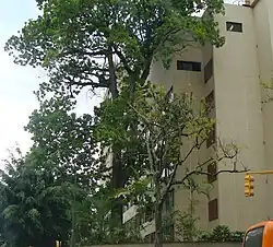Un mijao (Anacardium excelsum) se destaca junto a un edificio en la urbanización Altamira, en Caracas.