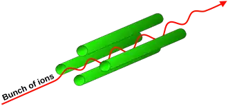 El cuadrupolo consta de cuatro barras metálicas paralelas. Cada par de varillas opuestas está conectado eléctricamente entre sí y se aplica una tensión de radiofrecuencia (RF) con una tensión de compensación de CC entre un par de varillas y el otro. Los iones se desplazan por el cuadrupolo entre las varillas. Sólo los iones de una determinada relación masa-carga alcanzarán el detector para una determinada relación de tensiones: otros iones tienen trayectorias inestables y colisionarán con las barras. Esto permite seleccionar un ion con un m/z determinado o explorar una gama de valores m/z variando continuamente la tensión aplicada. Matemáticamente, esto puede modelarse con la ayuda de la ecuación diferencial de Mathieu.[3]