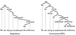 Otro método para realizar análisis sintáctico o parsing es utilizando gramáticas de dependencias, que surgen como una alternativa a las estructuras de frases.[3] En términos generales estas gramáticas definen una relación de dependencia entre cada elemento de una construcción (por lo general son oraciones pero también pueden ser solo frases) y su "cabeza" (o head ).[4] Estos elementos pueden ser palabras, tokens, lemas o incluso signos de puntuación. Adicionalmente se denomina a un elemento 0 o "raíz" (root) a la cabeza del constituyente principal, generalmente el verbo principal de la oración. Es importante no confundir dependencias con constituyentes, ya que las relaciones de dependencia generan pares únicos y ordenados.
