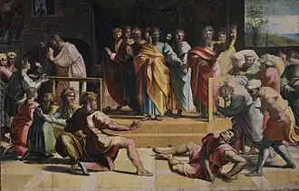 Aunque el suceso no suele aparecer en representaciones artísticas, es el tema de uno de los cartones de Rafael y también se ve en el relicario del siglo IV conocido como cofre de Brescia, ambos ilustrados en este artículo. También se muestra en una pintura de la década de 1590 de Ambrosius Francken el Viejo.