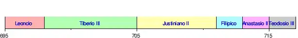 Leoncio Tiberio III Justiniano II (2ª vez) Filípico Anastasio II Teodosio III | ||||||||||||||||||||||||||||||