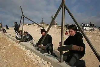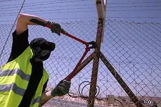 - ↑ La organización "Anarchists Against the Wall" y ISM demostraron su oposición cortando calles y confiscando campos