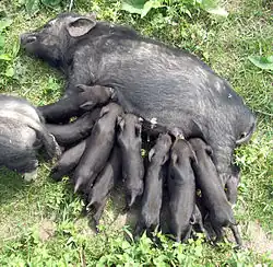 - Los marsupiales (Metatheria) los embriones nacen en una fase muy precoz de desarrollo, después de un período muy corto de la gestación (8 a 43 días) con un ínfimo grado de desarrollo. Se alojan en el marsupio donde permanecen estrechamente unidos a los pezones hasta completar su desarrollo, y los periodos de lactancia son proporcionalmente muy superiores a los de los placentarios.[5]