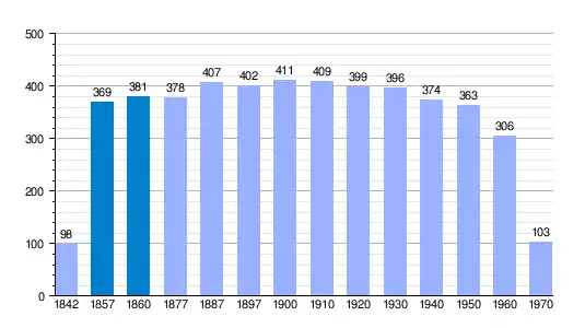 Población de derecho según los censos de población del INE Población de hecho según los censos de población del INEEntre el censo de 1857 y el anterior, crece el término del municipio porque incorpora a Novella y Tordelpalo |