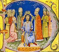 ![]() Retratado en una miniatura de la Chronica Hungarorum (Johannes de Thurocz, c. s. XVI). | ||