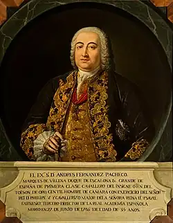 ![]() Retrato de Andrés Luis López-Pacheco y Osorio (1757), por Antonio de Lamas (Real Academia Española, Madrid). | ||