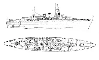 original: • 13 cañones de 305 mm (3 × 3 + 2 × 2) • 16 cañones de 152 mm • 13 cañones de 76 mm • 6 cañones de antiaéreos 76 mm • 3 tubos torpederos de 533 mm reformado: • 10 cañones de 320 mm (2 × 3 + 2 × 2) • 12 cañones de 135 mm (4 × 3) • 13 cañones de 76 mm • 10 cañones de 90 mm antiaéreos • 15 cañones antiaéreos de 37 mm • 16 cañones antiaéreos de 20 mm | |
