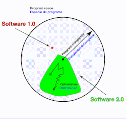 El 11 de noviembre de 2017 Andrej Karpathy publicó un artículo seminal titulado «Software 2.0» en el que afirmaba que las redes neuronales no eran otro clasificador, sino que representaban el principio de un cambio fundamental en la forma en que se desarrollaba software. El «stack» clásico del Software 1.0 está escrito en lenguajes como Python, C++. Se compone de instrucciones explícitas a la computadora escritas por un programador. Al escribir cada línea de código, el programador identifica un punto específico en el espacio del programa con algún comportamiento deseable. Por el contrario, el Software 2.0 está escrito en un lenguaje mucho más abstracto y hostil a los humanos, como los pesos de una red neuronal. Ningún ser humano está involucrado en la escritura de este código porque hay muchos pesos (las redes típicas pueden tener millones), y codificar directamente en pesos es algo extremadamente difícil.[28]